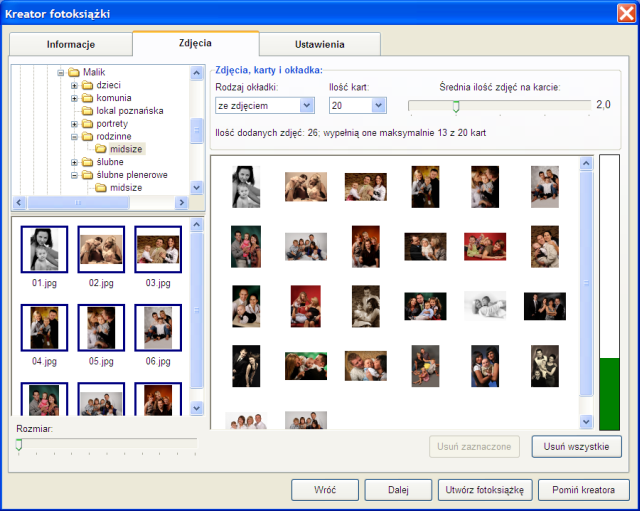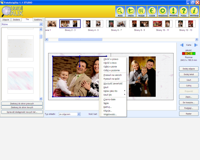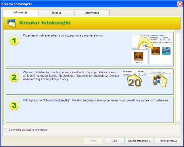 Program „Foto wydruki” służy do samodzielnego przygotowywania albumów fotograficznych (fotoksiążek) i kalendarzy. Pozwala na łatwe połączenie posiadanych zdjęć w jeden projekt, z możliwością dodania teł, tekstu, wyboru układu zdjęć i stron, a także zastosowania wielu filtrów graficznych. Gotowy projekt należy przesłać do naszego laboratorium (przez internet z wykorzystaniem samej aplikacji lub nagrany na płytę CD/DVD), gdzie zostanie wydrukowany.